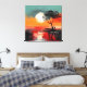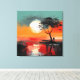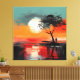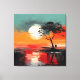 Esta obra de arte atmosférica captura un momento tranquilo de soledad bajo una puesta de sol radiante. Una figura solitaria se encuentra en la orilla del agua junto a un árbol azotado por el viento, recortada contra un vasto cielo pintado en cálidos tonos de naranja quemada, rojo coral y dorado suave. El sol sobredimensionado cuelga bajo en el horizonte, su luz reflejada en la superficie tranquila del lago, creando un espejo onírico de color y emoción.