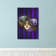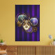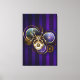 Araña de acero de oro y acero con relojes antiguos decorados con artes dorados sobre el fondo morado, rayado, texturado con lentes y engranajes de latón. Estilo Steampunk.