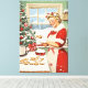En una acogedora cocina cubierta de nieve, la Sra. Claus es capturada en medio de la cocción de vacaciones. Vestida con un vestido rojo festivo con mangas de piel cortadas y un delantal a juego, sonríe cálidamente mientras prepara una nueva tanda de galletas. La escena está llena de Navidades que se alegran, con un árbol bellamente decorado con latas de caramelo y adornos rojos, mientras que la nieve cae suavemente por la ventana, añadiendo a la atmósfera mágica de la temporada.