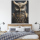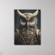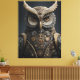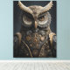 A commanding steampunk owl stares straight ahead, its face and body an intricate fusion of aged brass gears, riveted plates, and layered metallic feathers. Sharp mechanical ear tufts rise like horns above piercing golden eyes, while every detail of clockwork and plumage is rendered with Victorian precision against a moody dark background. This striking digital artwork blends nature and invention into a powerful portrait full of mystery and mechanical elegance, perfect for canvas prints, posters, phone cases, mousepads, throw pillows, and décor that adds bold steampunk character to any space.