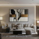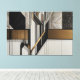 A bold fusion of geometric structure and organic delicacy: stylized black-and-white leaves intertwine with wood, metal, and golden diagonal lines. Art that bridges contemporary architecture and abstract nature—sophisticated, balanced, and deeply narrative.