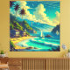 Esta obra de arte captura una serena escena costera de Okinawa en un estilo soñado, inspirado en el lofi. La playa dorada está bordeada de casas rústicas junto al mar, altas palmeras y un espigón de madera que se extiende hasta las olas turquesas. Los veleros se deslizan flotando por el agua, mientras que el fondo está formado por montañas verdes y exuberantes, un puente lejano y un cielo con atardecer brillante con nubes esponjosas y una luna creciente. La iluminación suave y nostálgica y los colores vivos y a la vez tranquilos crean un ambiente tranquilo y relajante perfecto para una estética lofitana.