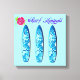 Surf Hawaii. Ilustracion acogedor con 3 tablas de surf de aspecto gruñón y un diseño de flores de los años 60 en las tablas. Flor rosa rosa rosa y un bonito tipo de letra de guión de color gris.