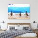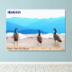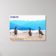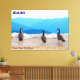 Tres ganeses de Canadá (Branta canadensis) contemplan salir al surf entrante a la orilla del lago Pend Oreille en Sandpoint, ID; las montañas azules están a lo lejos. También aparece el texto de personalizable "IDAHO". Personalizar agregando su propio texto adicional.