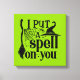 Este clásico diseño de Halloween presenta la espeluznante frase "Te pongo un hechizo" en una letra audaz de inspiración gótica. El blanco y el negro crean un ambiente sobrio, por lo que el diseño es perfecto para la temporada de Halloween. Acompañando el texto hay elementos de bruja icónica, incluyendo un gorra de bruja puntiaguda, un palo de escoba, una telaraña y una araña diminuta, todos dispuestos para crear una composición fascinante. El sutil detalle de los puntos alrededor del texto añade un toque de encanto mágico.