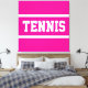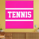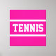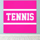 This sporty design features athletic TENNIS text inside white racing stripes against bright pink background. The text and colors can be personalized.