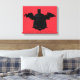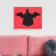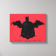 Batman illustration standing in front of bat wing style skyline of Gotham City.