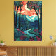 Impresión de un llamativo timbre que representa un sinuoso camino a través de un denso bosque, iluminado por una luna llena en un cielo dramático y empobrecido por las nubes. La obra de arte cuenta con una paleta de colores rica y contrastante, destacando los detalles intrincados del follaje y los rosas estilizados que florecen en los árboles. Una pequeña cabaña enclavada en el bosque le da un toque narrativo. La técnica de linocut proporciona una textura y profundidad distintas, enfatizando la naturaleza artesanal de la impresión. El efecto general es una mezcla de belleza natural y fantasía caprichosa, creando una experiencia visual cautivadora.