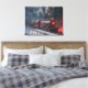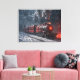Locomotora de vapor a la antigua en una tormenta de nieve con brillantes luces rojas.