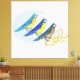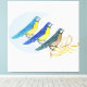 Tres pájaros de diferentes colores con una rama de árbol en un estilo boho sencillo.