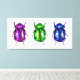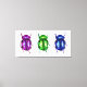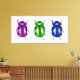 una colorida obra de arte con tres insectos similares pero de diferente color como una estampada decorativa de lienzo.