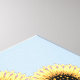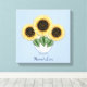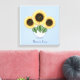 Tres girasoles con hojas de corazón en un jarrón sobre tela azul cielo Imprimir. ¡Un regalo hecho con amor y bondad para todos!