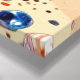A beautiful canvas wall art with a seaside tropical paradise illustration of a boardwalk along the coast, with palm trees with coconuts and strung fairy lights, blue ocean waves and small whimsical cottages.