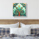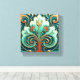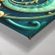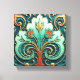 A turquoise and orange floral ornament with a golden frame, intricate details, symmetrical design, ornate swirls, vintage style, decorative elements, elegant composition, and a dark blue background.