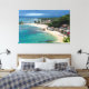 The dark, moody clouds on the horizon provide a sophisticated contrast to the sun-drenched shoreline, adding a layer of atmosphere and depth to the scene. This image isn't just a postcard; it's a window into the rhythm of island life, capturing everything from the gentle bobbing of boats to the lush, forest-covered hillsides. It brings a breath of fresh Atlantic air and the vibrant energy of summer into any home or gallery space.