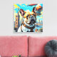 Un Bulldog francés se encuentra en una azotea con el telón de fondo de un fantástico paisaje urbano con emblemáticos monumentos mundiales. Varios barcos aéreos flotan en el cielo, lo que añade una atmósfera caprichosa.