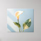 Un lirio de una calla con hojas verdes alargadas se alza con gracia contra un fondo azul suave, resaltado por la cálida luz del sol lanzando sombras suaves. Los pétalos delicados de la flor están muy iluminados, creando una composición serena y elegante.