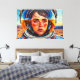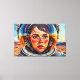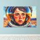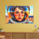 Esta obra de arte digital de Otis Porritt presenta un sorprendente primer plano de una mujer encerrada en un vibrante casco de astronauta amarillo. Su rostro, representado con trazos expresivos y pictóricos en tonos cálidos de piel y azules profundos para sus ojos, mira hacia arriba con una sensación de asombro. La visera del casco refleja un cielo azul vívido, reflejando el cielo expansivo y texturizado con pinceladas sobre un paisaje arenoso desolado. La técnica similar al impasto, característica del arte digital que imita la pintura tradicional, le da a la pieza una calidad dinámica y táctil, enfatizando el contraste entre la figura detallada y el entorno vasto y desconocido.