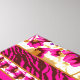 El diseño parece ser un diseño para una prenda de vestir, posiblemente un vestido o tela tradicional. Aquí hay una descripción detallada: ・ Sección superior: Presenta un patrón floral con flores rosas y hojas verdes sobre un fondo blanco. El escote está adornado con motivos dorados y rosas. ・ Banda media: Contiene una huella animal en rosa y blanco, bordeada por dos delgadas franjas doradas. ・ Sección inferior: Repite ampliamente el patrón de impresión animal. La combinación de estampados florales y animales crea una declaración de moda vibrante y audaz, posiblemente para vestimenta cultural.