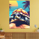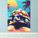 un diseño fresco de inspiración retro que reune las vibraciones relajadas de una tortuga colgada en la playa y la estética icónica de la cultura de las ondas sintéticas. Imagínate esto: una tortuga elegante que se pone unas gafas de sol elegantes y disfruta del resplandor neón de un sol inspirado en las ondas sintéticas, con una escena de playa fascinante y palmeras al fondo.