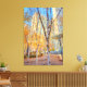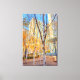 La imagen muestra un bosque de abedules en un ambiente urbano durante el otoño. Los árboles tienen corteza blanca con marcas negras y están rodeados de hojas amarillas caídas. Al fondo, altos edificios con fachadas de cristal se alzan contra un cielo azul claro. Las lámparas de la calle se ven entre los árboles, lo que contribuye a crear un ambiente urbano.