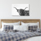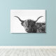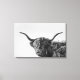 Tinta de lienzo de una robusta pero divertida vaca de la glándula escocesa con grandes cuernos, largos pelos delante de los ojos y la boca medio abierta en blanco y negro / monocromo. ¡Una gran decoración en la pared!