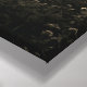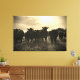 Esta pintura en la pared de tela envuelta de color sepia tiene una imagen de vacas negras y blancas en un pasto con un sol brillante detrás de ellas.
