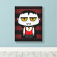 Pequeño personalizado bebé vampiro con grandes ojos de gato amarillo, vestido con un chaleco rojo y una capa negra.