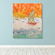 diseño floral de bonito en la vela de este velero, aguas de mar agitadas y un brillante cielo naranja, una obra de arte de diversos medios.