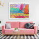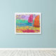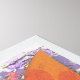Se exhibe una obra de arte mixta muy colorida, con velas de dos veleros fabricadas con material de tarjetas decorativas, así como varios colores de pintura acrílica púrpura, acuática, azul, amarilla, roja y naranja diseñada como fondo.