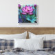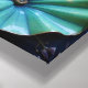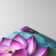 Art Nouveau ceramic tile with a vibrant pink lotus flower with intricate petals, surrounded by green leaves and buds, set against a dreamy blue background with bokeh lights, framed with an ornate copper border.