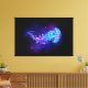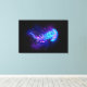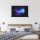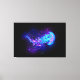 Gran medusa azul, de dibujo artístico, brillante y brillante, con largos tentáculos sobre fondo negro con bioluminiscencia violeta. Luminosas medusas.