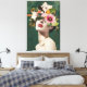 Una fascinante obra de arte digital de una mujer con flores y exuberante vegetación adorna su rostro, oscureciendo sus ojos y creando una sensación de misterio y conexión con la naturaleza. Sus suaves y estilizadas características contrastan con las vibrantes flores y follaje, mientras que el rico fondo verde resalta la belleza de su corona floral. La composición mezcla surrealismo y elegancia, encarnando una armonía entre la forma humana y la naturaleza.