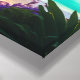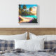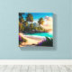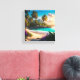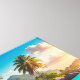 Un paraíso tropical con vistas al océano, palmeras y flores moradas alrededor, una pequeña playa. Estilo de diseño de pintura acrílica.