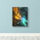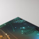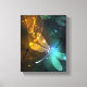 Vuelo de libélula resplandeciente, verde, dibujada de forma artística, con alas transparentes, verdes y amarillas sobre un brillante fondo nocturno con plantas de pantano y luciérnagas. Flauta de dragón resplandeciente.