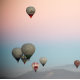 Temprano en la mañana, un vuelo en globo sobre montañas nevadas, Cappadocia, Turquía.