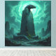 Eine mystische Schlange umschlingt einen schwarzen Monolithen inmitten einer kargen, außerweltlichen Landschaft. Ein leuchtender grüner Wirbel im Himmel verstärkt die geheimnisvolle und kraftvolle Atmosphäre. Dieses Werk verbindet Symbolik von Macht, Schutz und kosmischer Energie.