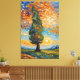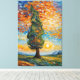 A vibrant, textured oil painting capturing a solitary cypress tree swaying dramatically against a swirling sunset sky. The tree’s foliage flows like green flames, echoing the golden sun and fiery orange clouds above. Below, rolling hills and distant mountains stretch under a palette of rich blues, yellows, and earthy tones — all rendered in bold impasto strokes that bring the landscape to life with emotion and movement. Perfect for those who love expressive, Van Gogh-inspired nature art.