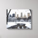 A snowy Central Park in New York City, with the Manhattan skyline visible in the background. A lone figure stands by a partially frozen pond.