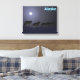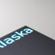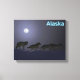 Noche brillante. Noche de invierno fría, cruel, iluminada por la luna; Hambre. Una maleta de lobo en el prowl. El texto que dice "Alaska" aparece en azul brillante y blanco.