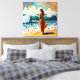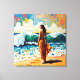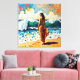 An oceanic themed wall art. A beautiful ai illustration done in an oil painting impasto style. A woman walking on the beach with an abstract mosaic vibrant colorful style.