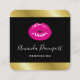 Tarjetas de visita con un dibujo de un par de brillantes labios femeninos rosados sobre un fondo negro.