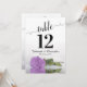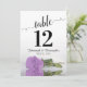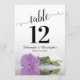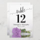 Estas hermosas tarjetas numerales facilitarán a los clientes la posibilidad de encontrar sus asientos en la recepción de su boda. Cuenta con un diseño magnífico con caligrafía de escritura de encaje y un rosa lila de color púrpura sobre su lado con ondas y reflejos. Hay espacio para los nombres de la pareja y la fecha de boda.