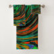 Este conjunto de toallas de baño de colores llamativos presenta un diseño de torrente retro de color verde animado y Naranja con acentos Verde azulados, negros, acuáticos y ocre quemado. El resultado es un diseño colorido, abstracto y retro que te encantará.