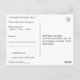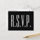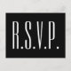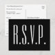 Este diseño de postal de R.S.V.P limpio y respetable presenta el mensaje "R.S.V.P." en el frente. También incluye un formulario RSVP de personalizable en la parte posterior, junto con una dirección de personalizable a la que se enviarían las tarjetas RSVP completadas. Tarjetas RSVP como esta podrían ser usadas para averiguar quién asistirá a un fiesta de retiro, una ducha de matrimonio, un fiesta de aniversario de un boda o alguna otra celebración.
