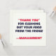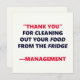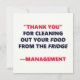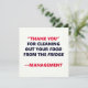 ¿Recuerdas cuando limpiaste la comida del frigorífico? La gerencia quiere agradecerte con esta tarjeta de felicitación como un incentivo firme para tener cuidado con tus almuerzos caseros, que se filtran un poco.