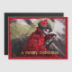 Antigua foto de la era eduardiana de la década de 1900, renderizada y coloreada digitalmente, con una niña con abrigo y sombrero rojo con flor de poinsettia y velo en el volante, está nevando y sonríe mientras conduce un automóvil, con el mensaje dorado "Feliz Navidad". Tarjeta navideña perfecta para poner una sonrisa en tu rostro.