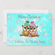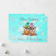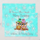 Tarjeta de Navidad con dos búhos acurrucados en una rama con un bonito fondo de copos de nieve en teal y blanco. Agrega tus nombres y mensaje personalizado en el área de personalización.