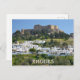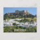 Foto del pueblo de Lindos, isla de Rodas, Grecia, con la acrópolis en la ladera de la colina al fondo.