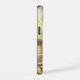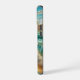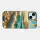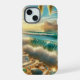 Un hermoso estuche de teléfono metalizado mágico en la costa. Bonito con olas oceánicas, palmeras, conchas, pez estrella y cristal.